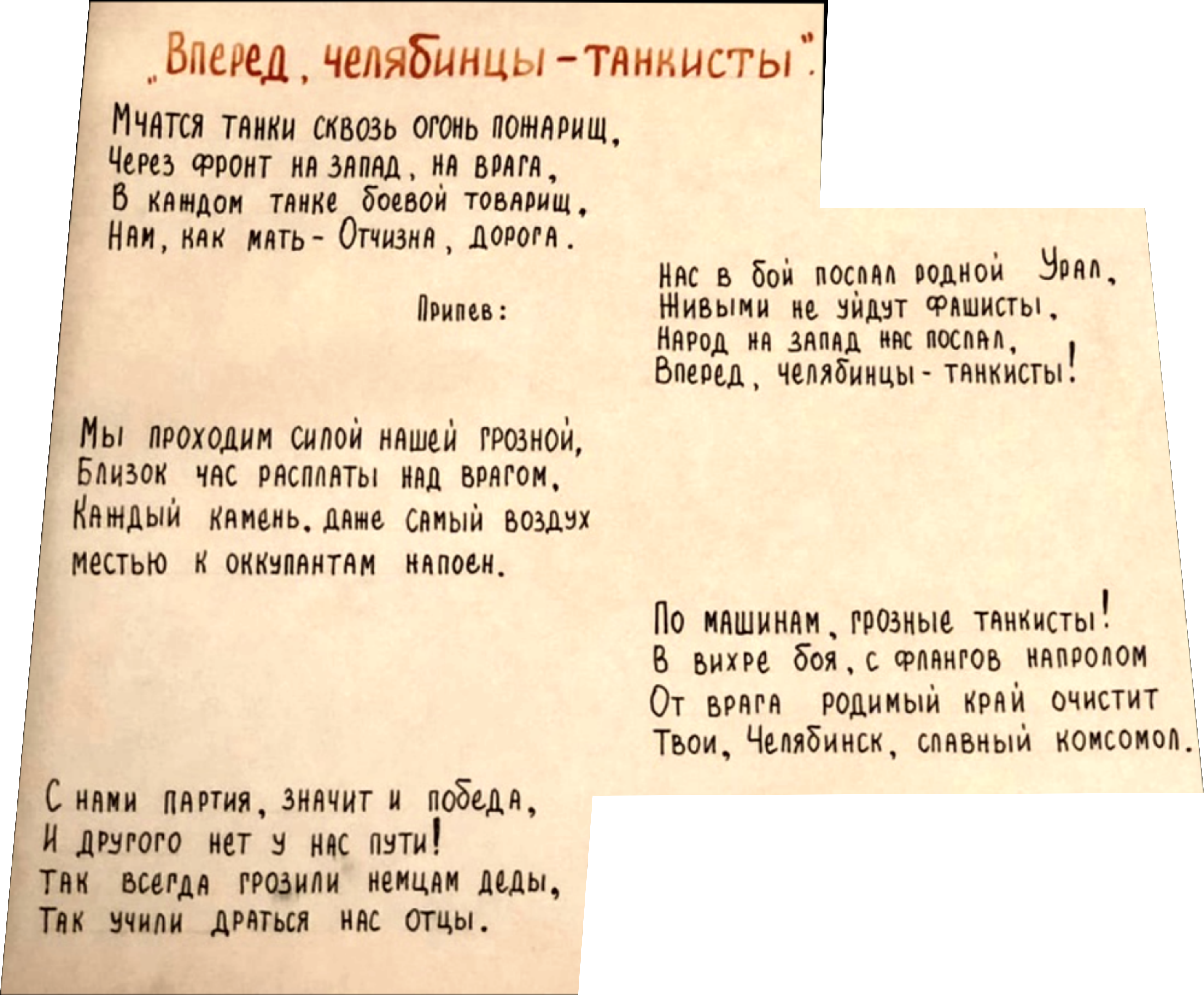 Дорогие товарищи бойцы, командир и полит.работники! Сегодня вы отправляетесь на фронт, на смертельную битву с проклятыми гитлеровскими бандитами. На великую священную месть посылает вас Родина. Беспощадно бейте врагов. Мстите подлым бандитам за каждую каплю крови, пролитую советскими людьми , за кровь беззащитных стариков и детей, растерзанных фашистскими зверями. Будьте злее, беспощаднее в бою. Пусть ваши сердца гневом горят к врагу. Давите их гусеницами своих танков! Пусть знамя, врученное вам Челябинским комсомолом, зовет вас на подвиг. Смерть немецким оккупантам!
