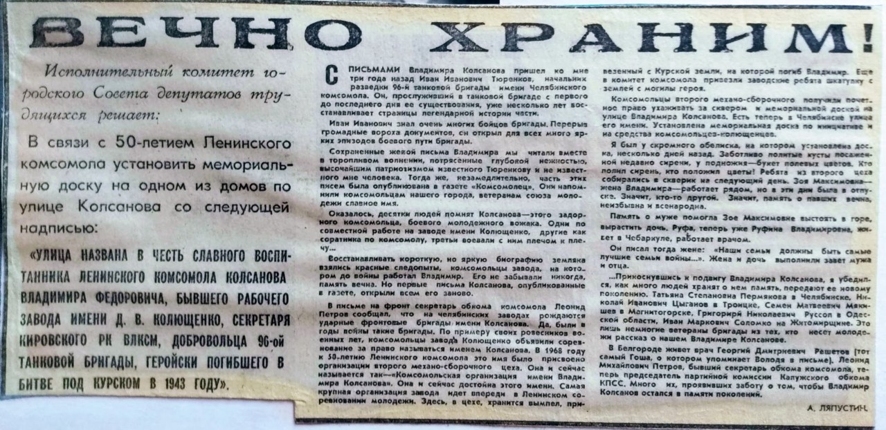 Через тысячи километров достойно пронесла она знамя Челябинского комсомола. Не померкнет в памяти народа радость Победы. Вечную память народов Европы заслужили наши воины, павшие за их освобождение; поколение за поколением всех людей будут склонять головы перед священными могилами солдат-героев.