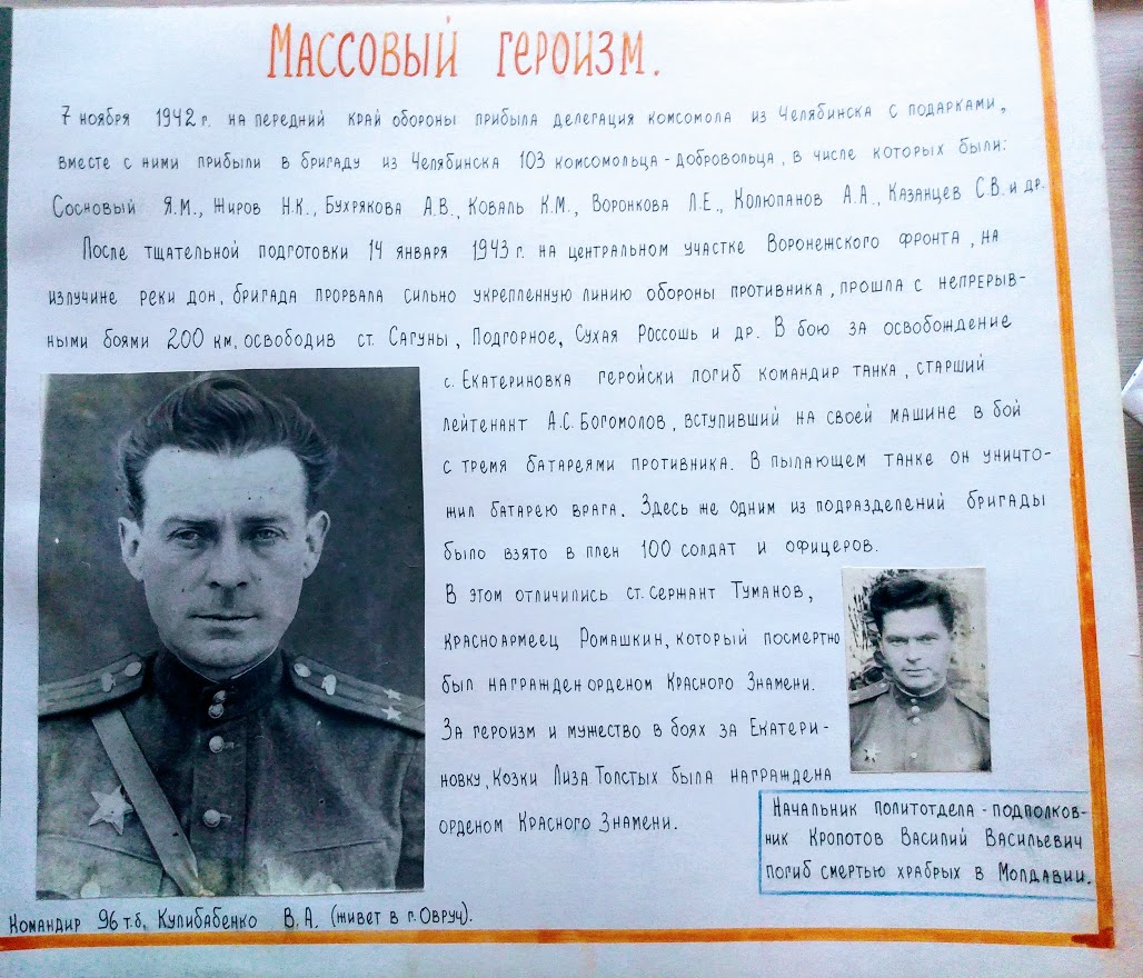 7 ноября 1942 г. на передний край обороны прибыла делегация из Челябинска с подарками, вместе с ними прибыли в бригаду из Челябинска 103 комсомольца-добровольца в числе которых были: Сосновой Я.М., Жиров М.К., Бухрякова А.В., Коваль К.М., Воронкова Л.Е., Колюпанов А.А., Казанцев С.В. и др. После тщательной подготовки 14 января 1943 г. на центральном участке Ворошежского фронта, на излучине реки Дон бригада прорвала сильно укрепленную линию обороны противника, прошла с непрерывными боями 200 км освободив ст. Сагуны, Подгорная, Сухая Россошь и др. В бою за освобождение с.Екатериновка геройски погиб командир танка , старший лейтенант А.С. Богомолов, вступивший на своей машине в бой с тремя батареями противника. В пылающем танке он уничтожил батарею врага. Здесь же одним из подразделений бригады было взято в плен 100 солдат и офицеров. В этом отличились ст. сержант Туманов, красноармеец Ромашкин, который посмертно был награжден орденом Красного Знамени. За героизм и мужество в боях за Екатериновку Лиза Толстых была награждена орденом Красного Знамени.